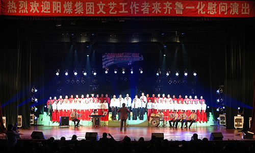 2月20日晚,齐鲁一化工人影剧院张灯结彩,锣鼓喧天,一派节日景象。阳煤集团五矿文工团慰问演出在这里举行。剧场正门两侧,垂挂着“热烈欢迎阳煤集团公司领导莅临齐鲁一化公司指导工作”和“衷心感谢阳煤集团公司领导对齐鲁一化公司的关心支持和帮助”的巨幅标语。走进剧院大厅,容纳近2000人的工人影剧院,上下两层座无虚席,人头攒动。舞台对面的二层看台上醒目地写着“同唱和谐之歌,共建和谐企业,在阳煤集团的正确领导下,满怀信心,拥抱新春”的横幅标语,表达出齐鲁一化与阳煤集团和谐共建的美好心愿。