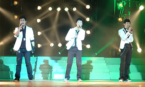 观众的掌声又响起来了,由黑哥们儿组合演唱的《我爱北京》掀起了小高潮。三位年轻的歌手活力四射,靓丽无比。他们手持麦克风,走下舞台,与热情的观众频频握手交流。演员唱得如痴如醉,观众听得拍手叫好。演员观众相互感召,互动至极。