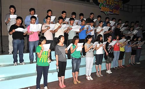 排练场上,车间领导、部分管理和维修人员齐上阵,工艺一班、三班的员工不分老少,利用业余时间参加排练。听录音,看视频,感受旋律,熟悉歌词,一遍一遍地细听,一遍一遍地跟唱,大家热情高,心气足,一个多小时的排练,收到了较好的效果。